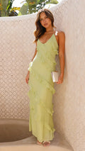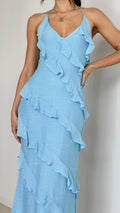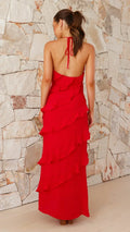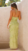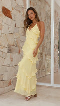A flowing halter maxi dress featuring cascading ruffle tiers and a flattering open back. Designed with a gathered neckline and adjustable tie closure, it offers effortless elegance for both daytime and evening occasions.