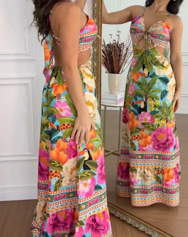 Detail: Colorful tropical floral and toucan print, side cutouts, adjustable straps, maxi length