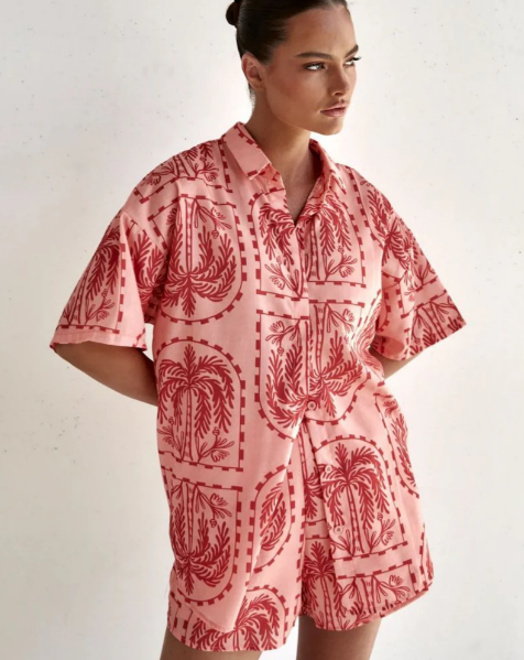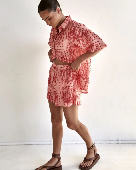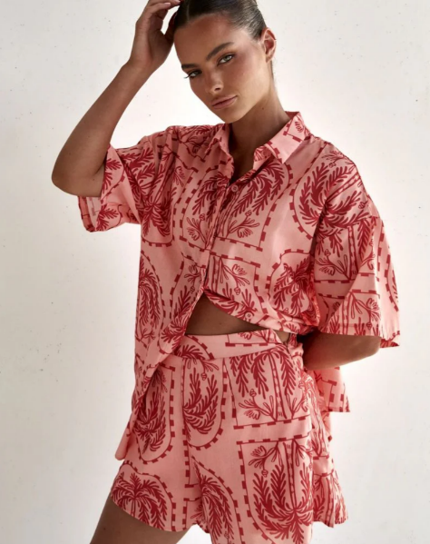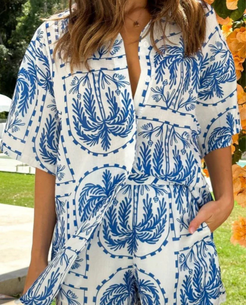 This is our Tropical Print Short Sleeve Button-Up Shirt and High-Waisted Shorts Set