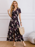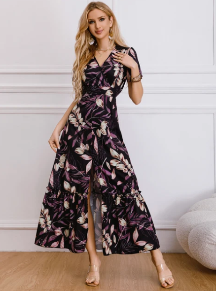 A breezy maxi dress that brings vacation energy with its vibrant botanical print and relaxed silhouette. A flattering V-neckline, short sleeves, and an empire waist give way to a flowing tiered skirt with front slit detail—perfect for effortless days or dressed-up evenings.
