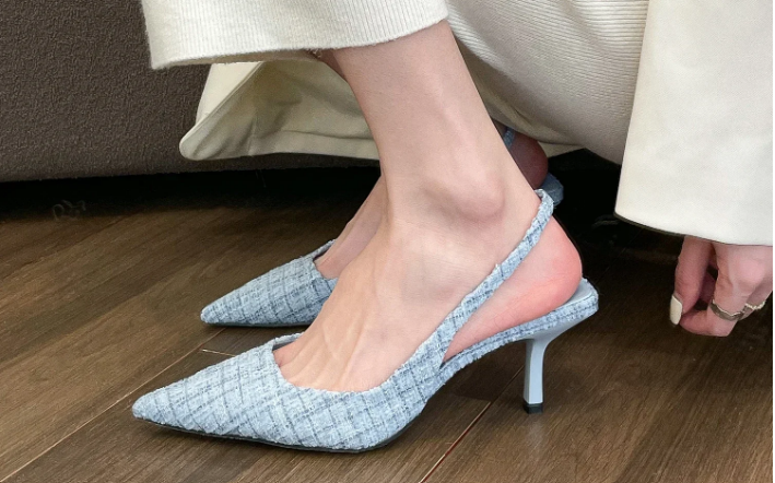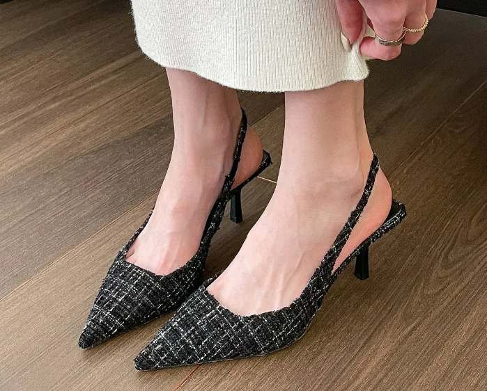 This is our Tweed Pointed Slingback Kitten Heels