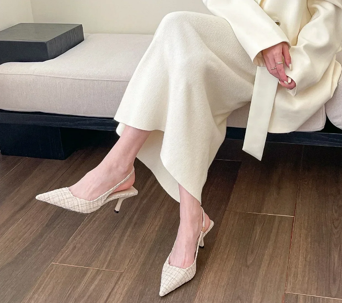 A refined heel that brings classic elegance to your everyday or evening looks. Crafted in textured tweed with a pointed toe, low kitten heel, and an adjustable slingback strap, it blends comfort and sophistication in one timeless silhouette.