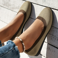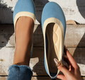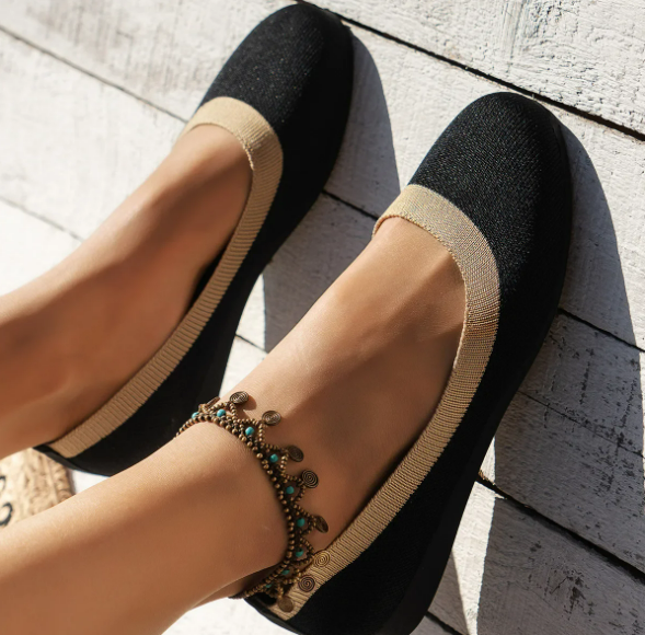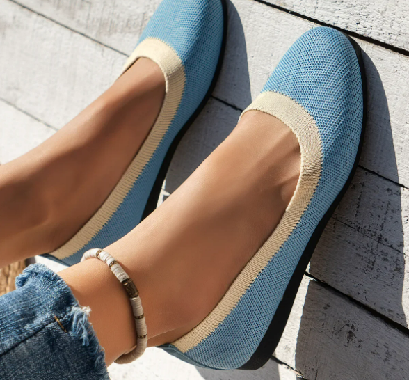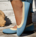 Designed for everyday ease, these two-tone flats feature a soft rounded toe and breathable knit texture. The stretchy upper hugs the foot comfortably, while the contrast trim adds a subtle statement. Perfect for effortless, all-day wear.