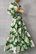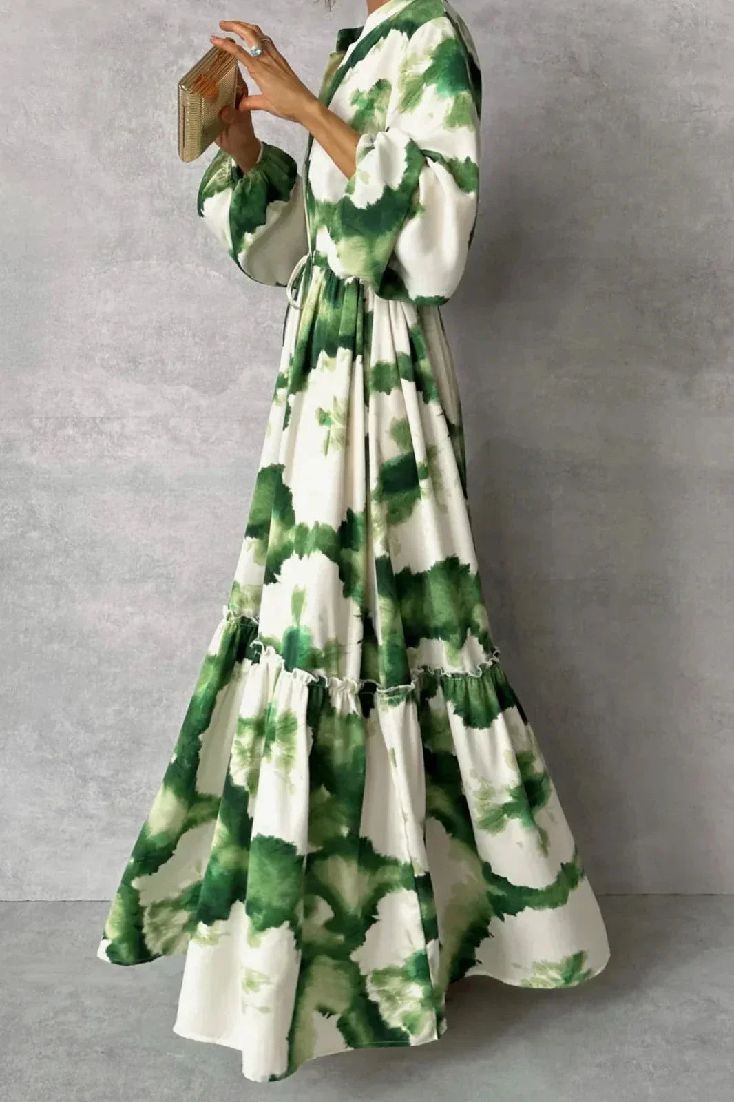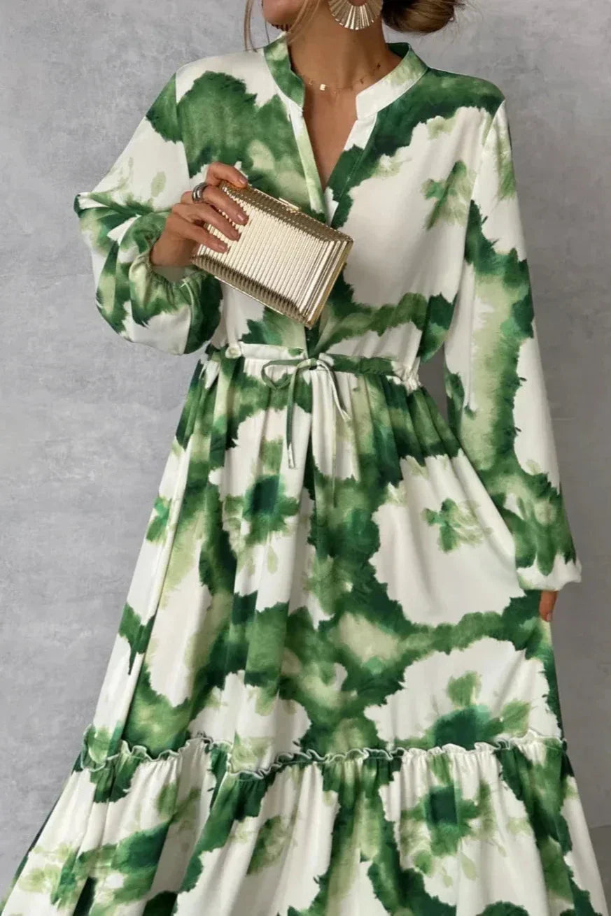A flowing maxi dress that blends artistic flair with timeless elegance. Featuring a brushstroke-inspired watercolor print, soft V-neckline, and long sleeves, it offers a relaxed yet refined silhouette. The gathered waist with a tie accent and tiered hem add graceful movement—perfect for serene days or elevated evenings.