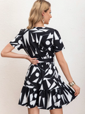 • Detail: Abstract print, wrap front, belt detail, short sleeves, mini length