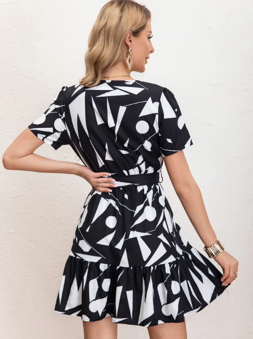 A chic blend of bold abstract print and a flattering wrap silhouette — this dress is perfect for making a statement with ease and elegance.